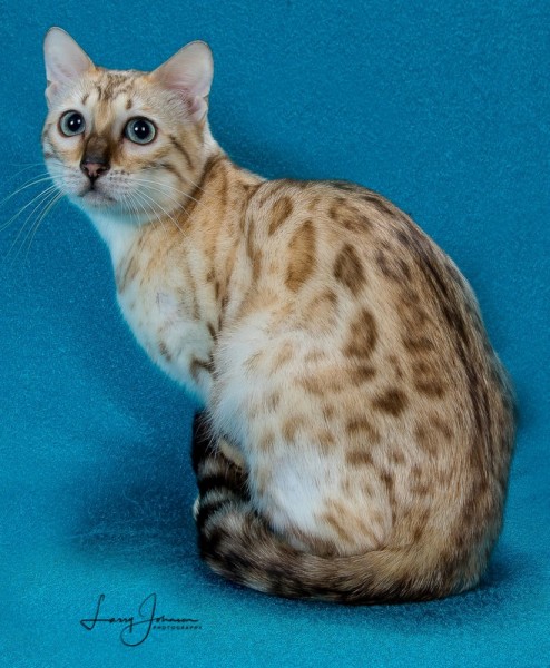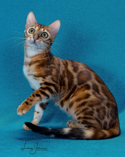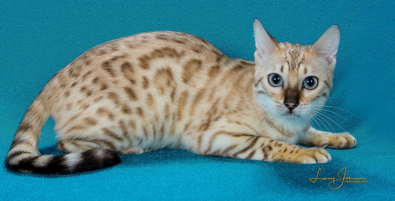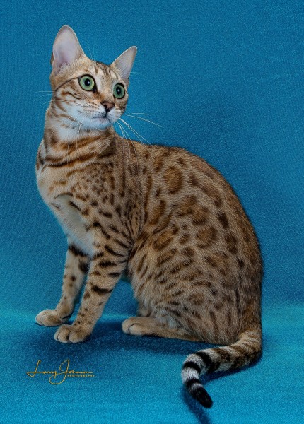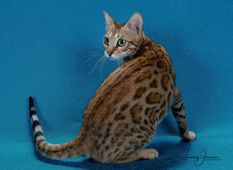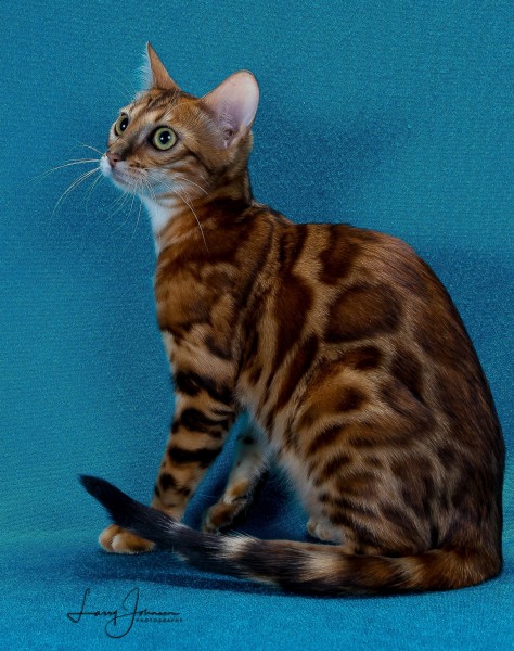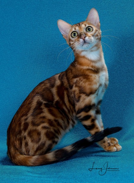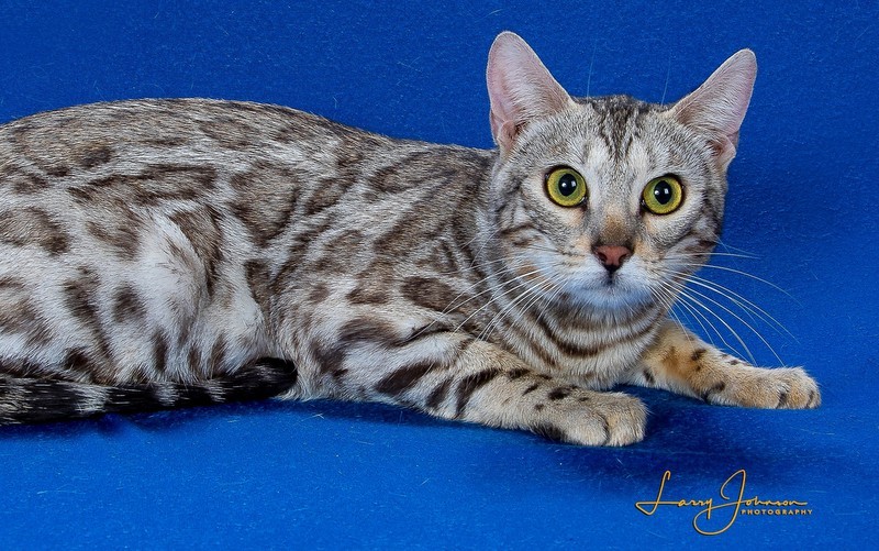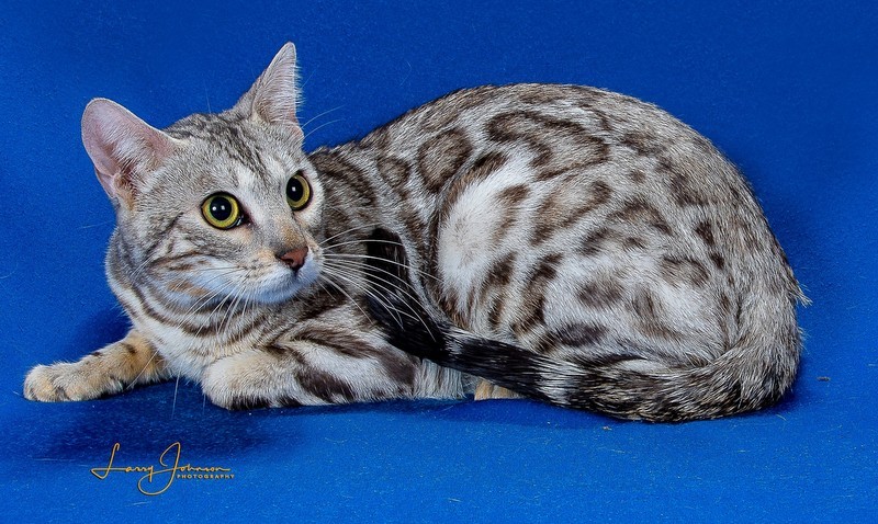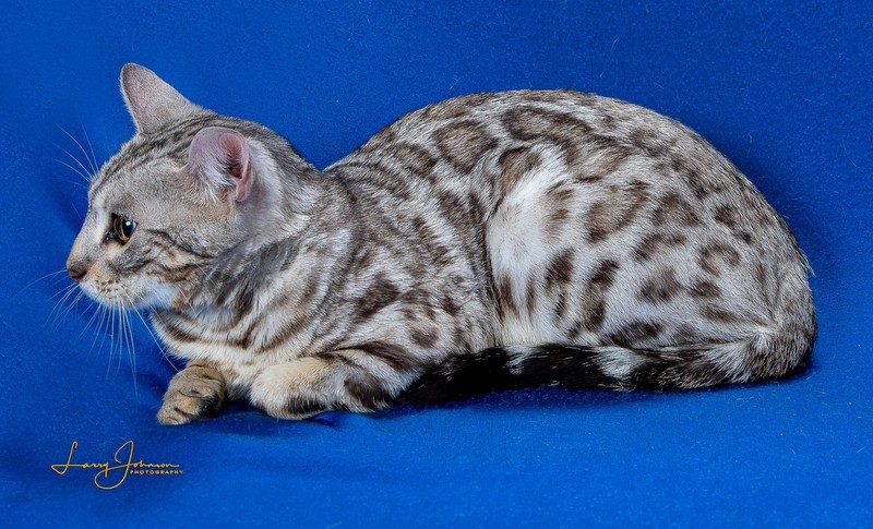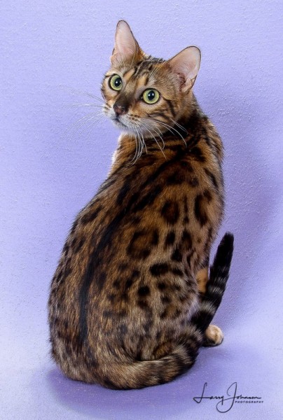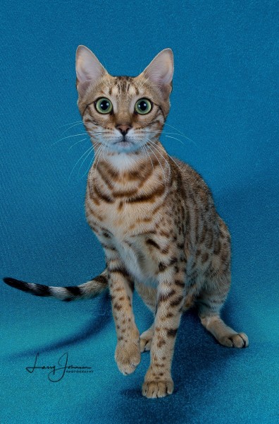 As Lia was growing up, she really grew on me. When I had her genetically tested, she had the biggest genetic diversity that I had ever seen. After seeing that, I had to keep her. She has become a very sweet cat. Lia has 2 babies available with Blue. See them on the kittens page.